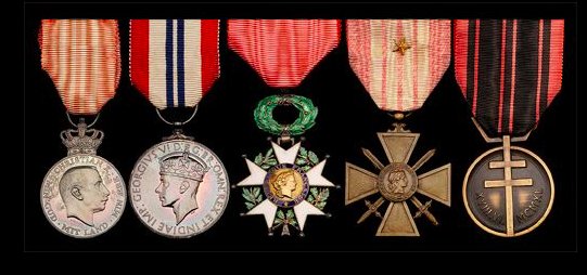 Danish Medal for Participation in the War 1940-45, in its red A. Michelsen, Copenhagen card box of issue; Great Britain, King’s Medal for Courage in the Cause of Freedom, unnamed as issued, in its Royal Mint case of issue; French Legion of Honour, Chevalier’s breast badge, silver, gilt and enamel, in its case of issue; French Croix de Guerre 1939, with gilt star, in red leather presentation case; French Resistance Medal 1939-45, in a Diets, Paris case of issue, extremely fine